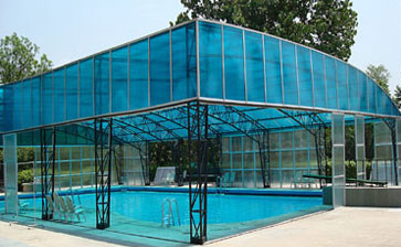 National Fiber Glass Industries corrugated sheet system provides economic and permanent building of considerable versatility for sport halls, covered stores, workshop, warehouses, public and private swimming pools etc…., without the need for elaborated foundation, structural sub-frames sports or additional internal linings. The system can be manufactured in any color, fully translucent, opaque, with either a single or double skin, insulted or non-insulated sections as required.